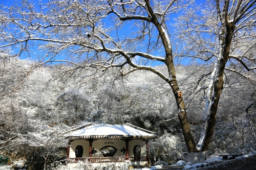 其中以虎山凌云栈道为特色亮点,栈道取意景区乾隆行宫内“有凌云意”匾额,故而得名。栈道依山势而建,共有台阶1046级,蜿蜒曲折、架虚构空、藏奇露险,将叠浪岩、碧云亭、读枫阁等景点串联,沿途不时可见山体岩壁上石刻。行走于栈道之上,可感受自然野趣,可畅观摩崖石刻,更可赏枫观景,是一条融景观、生态、文化为一体的栈道。