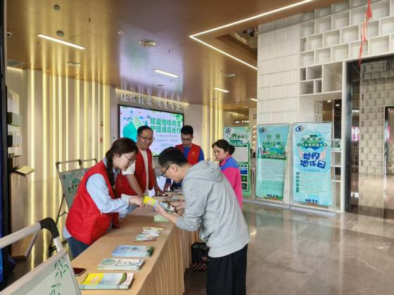 4 月 21 日,经开区分局在区图书馆设置了宣传布展,志愿者向来往群众发放世界地球日、保护生物多样性、自然资源普法知识问答等宣传手册,普及资源保护知识。
